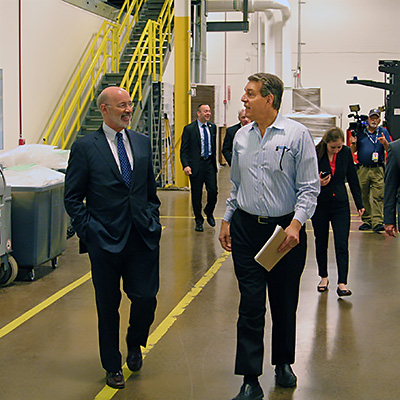 The Governor’s visit included two roundtable discussions, the first with current and retired NewAge employee-owners and a second with CEOs of other area ESOP companies. Pennsylvania State Representatives Bernie O’Neill and Frank Farry, Philadelphia City Councilman at-Large Derek Green, and representatives from PaCEO, the Pennsylvania Center for Employee Ownership, also participated in the discussions.