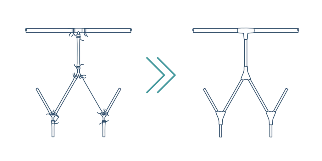 The traditional assembly on the left is made from: nine pieces of tubing, four barbed fittings, and double cable